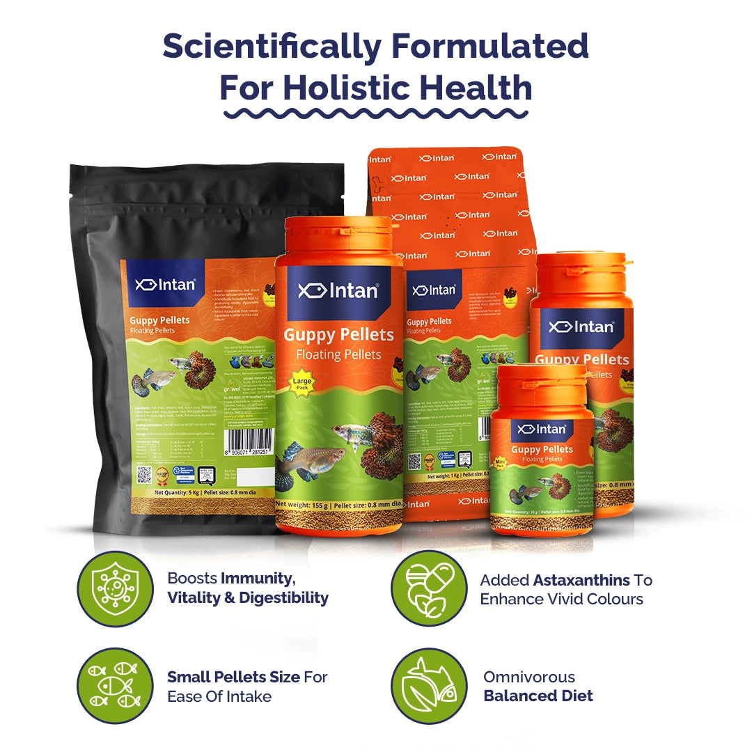 Intan Guppy Pellets (Floating Pellets), a Highly Nutritious Ornamental Fish Food with 40% protein, are specially formulated for different varieties of Guppies & small surface-eating fish to match their natural diet. These pellets are made from high-quality ingredients of both plant & animal origin, blended together to provide wholesome nutrition that is easily digestible by their short digestive tracts. Considering that guppies have small, upward-shaped mouths, the small size of our pellets makes them easy for these fish to consume.