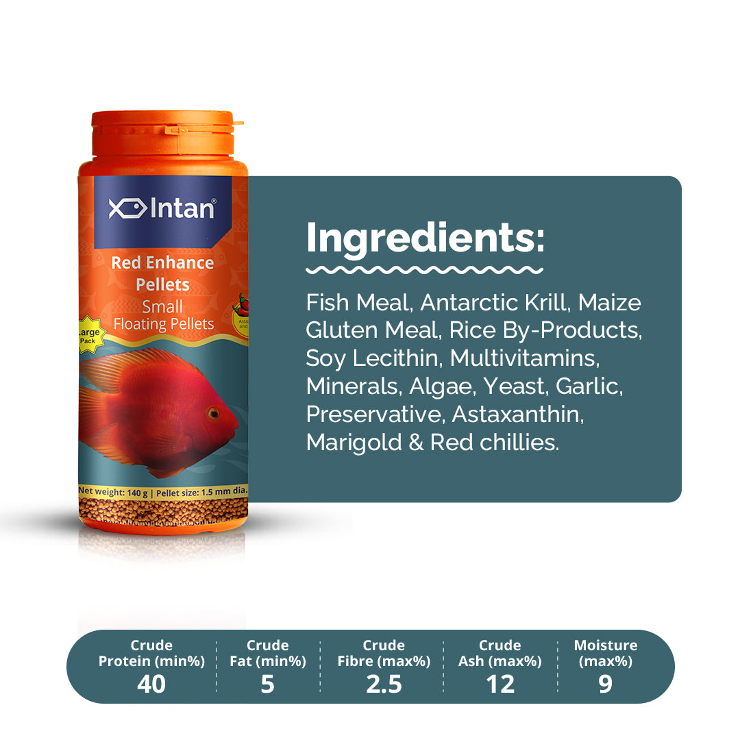 Intan Red Enhance Pellets (Small Floating Pellets), a Highly Nutritious Ornamental Fish Food with 40% protein, are specifically formulated for Parrotfish & other red-coloured fish. This balanced diet is designed to intensify the red pigmentation in fish, achieved through the addition of natural Astaxanthin & de-seeded Kashmiri chilies. The wholesome nutrition provided by these pellets promotes healthy feed intake, enhanced digestibility, & disease resistance.